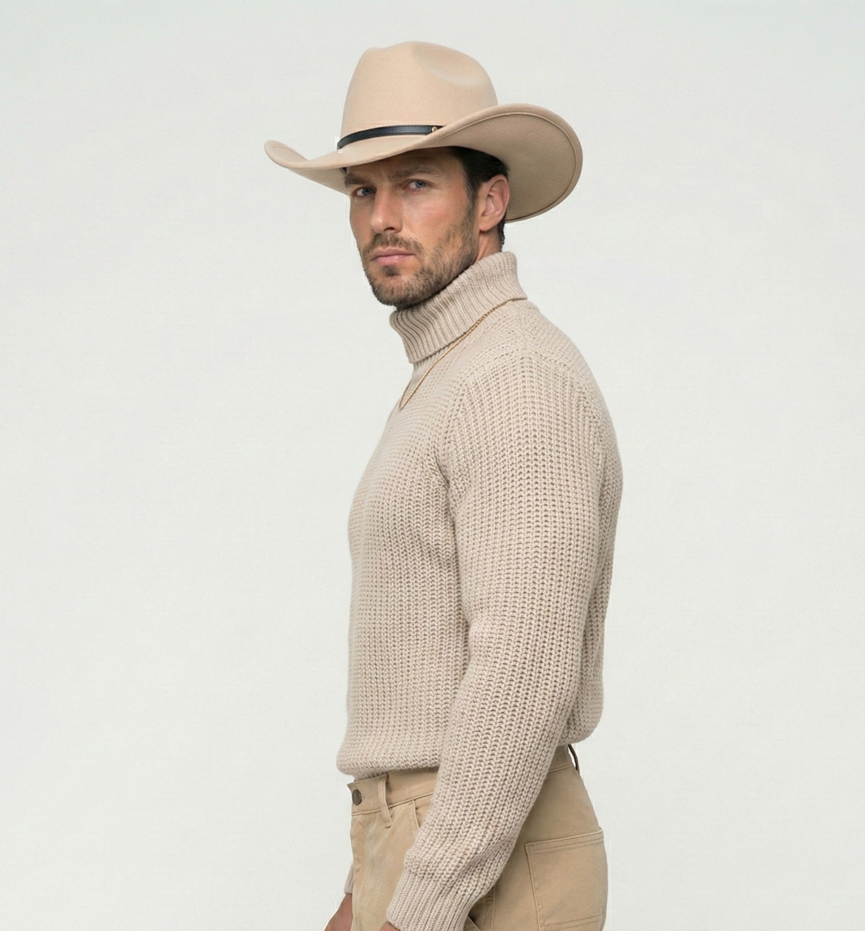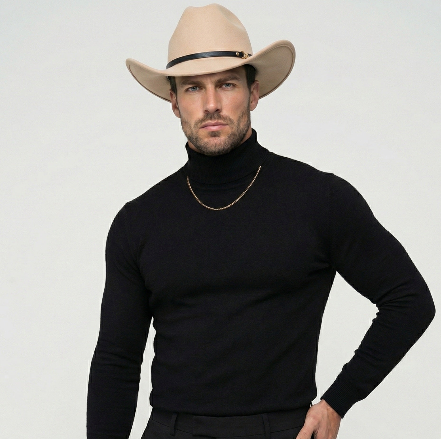Chapeau de style western au design classique avec couronne structurée et larges bords relevés. Coloris beige clair avec ruban noir orné de détails dorés. Convient pour un usage quotidien, festivals, événements western ou tenues casual. Bords larges offrant une protection solaire. Style polyvalent s'adaptant aux looks country, urbains ou décontractés. Confort optimal pour un port prolongé.
